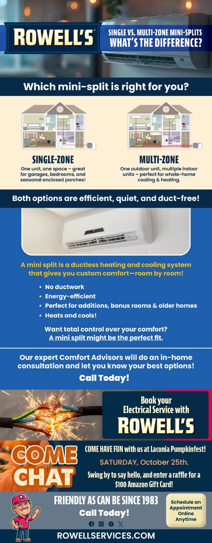 "Friendly As Can Be Since 1983!" When you need help with your plumbing, drains, heating, cooling or electrical in Pittsfield, you can always rely on Rowell's Services! Call us now or book online!